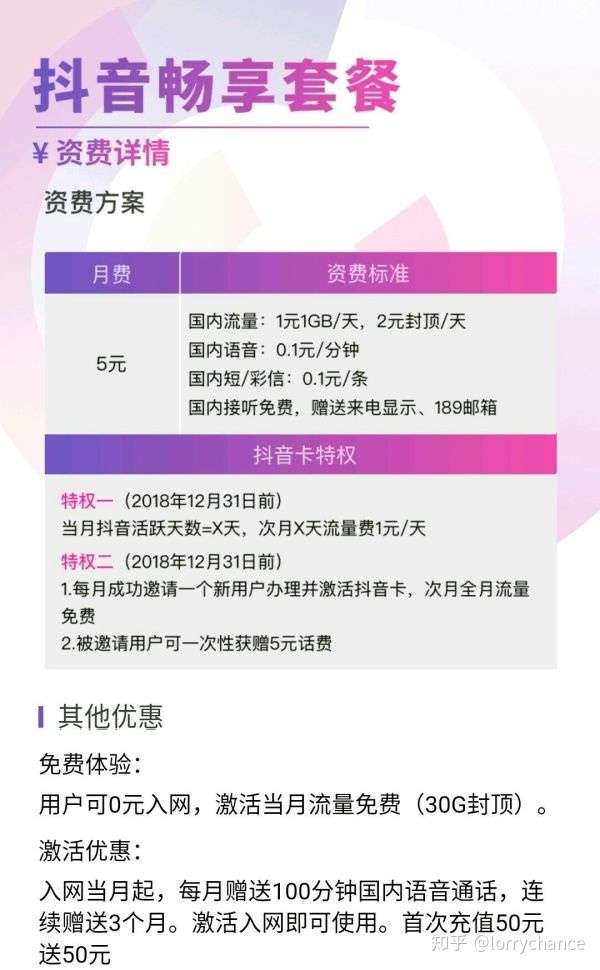 2.电信抖音卡【抖音畅享套餐】:月租5元无套内,全国日租1元1GB,用满2元当天不限量。比米粉卡费用还要低。不过限速比较早也比较狠,月累计30GB起限速1Mbps。但在电信互联网套餐里已经是很优惠的了,也很适合老号转套餐。