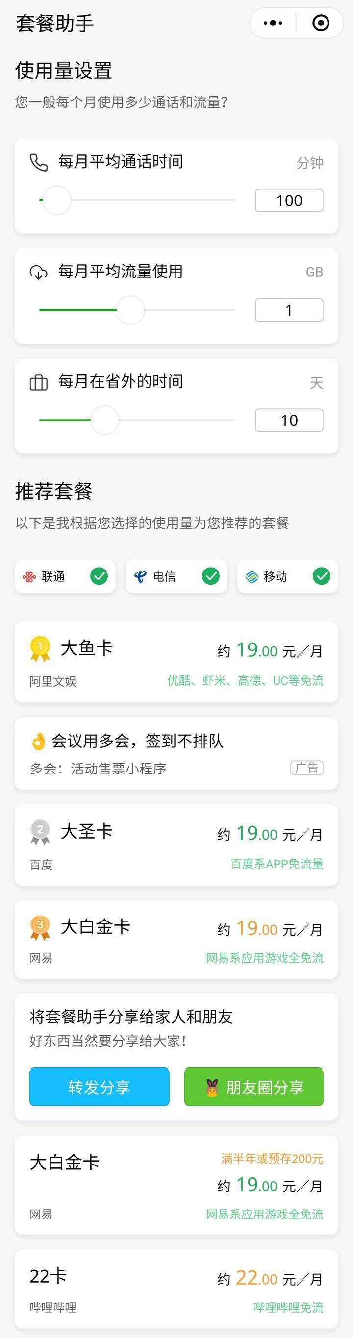 的微信小程序“套餐助手”就能很方便的帮到你。2018年1月18日它的算法进行了修正,不再出现22卡用2G+100分钟=19元这样的错误,数据也进行了更新,已经很全面了。感谢分享。