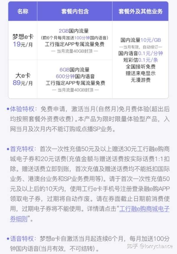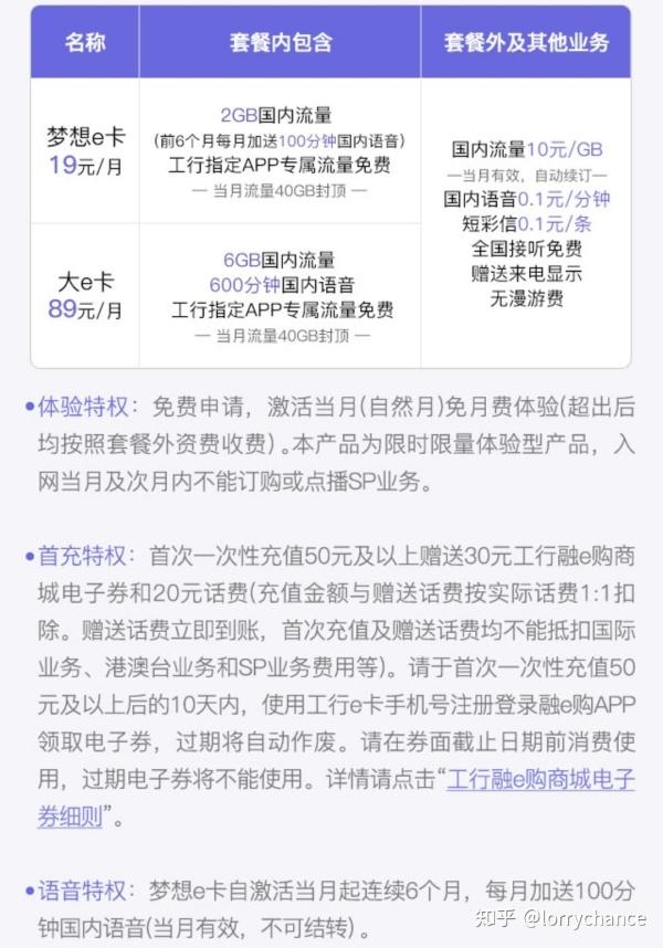 2.联通工商银行梦想e卡【链接】:月租19元含全国2GB,超出后全国流量10元/GB,适合3GB以内用量,2018年1月起可升级每月最多送100分钟通话。2018年3月末前申请,头6个月每月再加送1GB。但如果每月超过3GB,开支就会达到39元,倒不如驴粉卡或联通1元日租卡了。